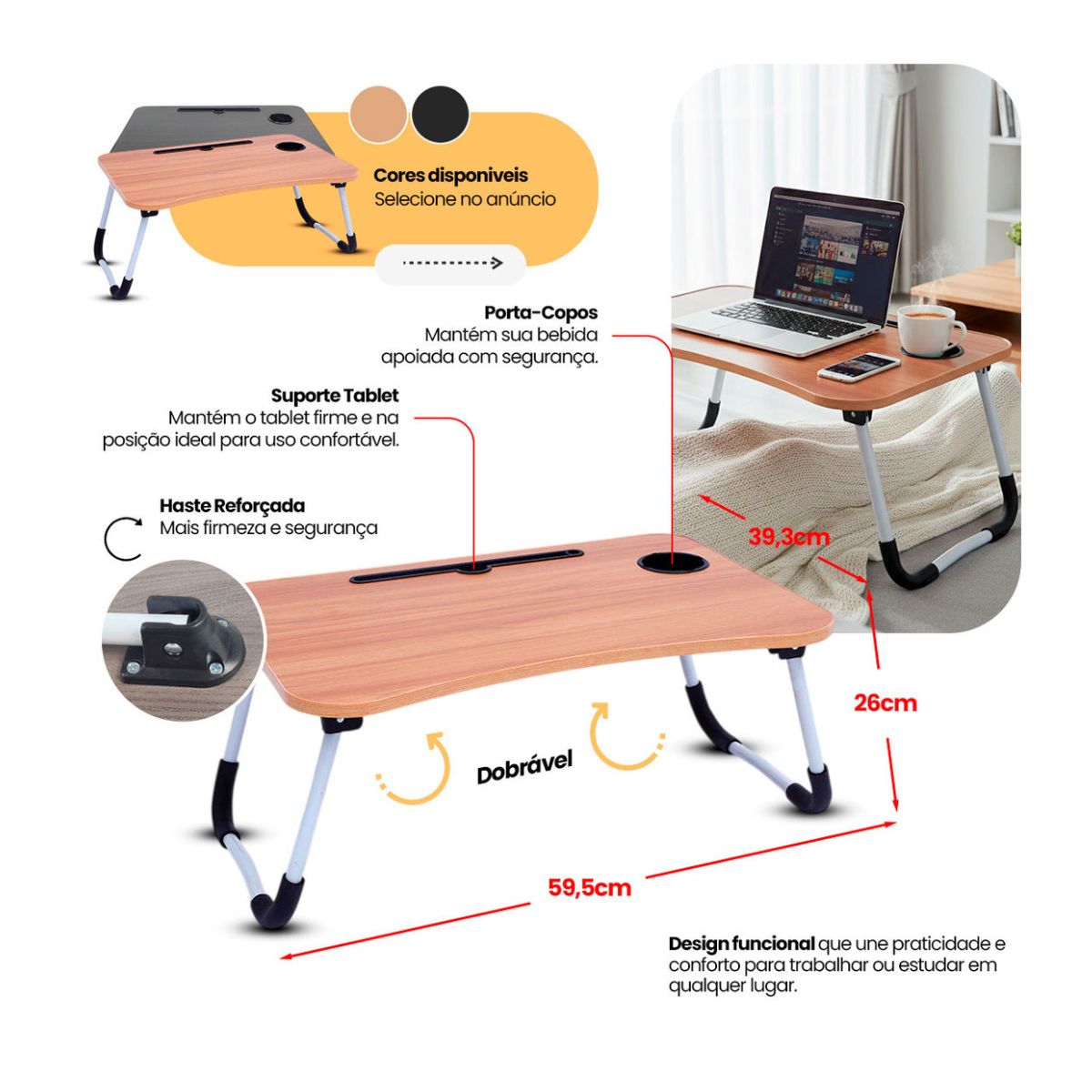 A Mesa Dobrável Portátil para Notebook foi desenvolvida para proporcionar mais conforto, ergonomia e organização, permitindo o uso na cama, sofá ou mesa, sem abrir mão da postura correta. Perfeita para home office, estudos ou lazer.